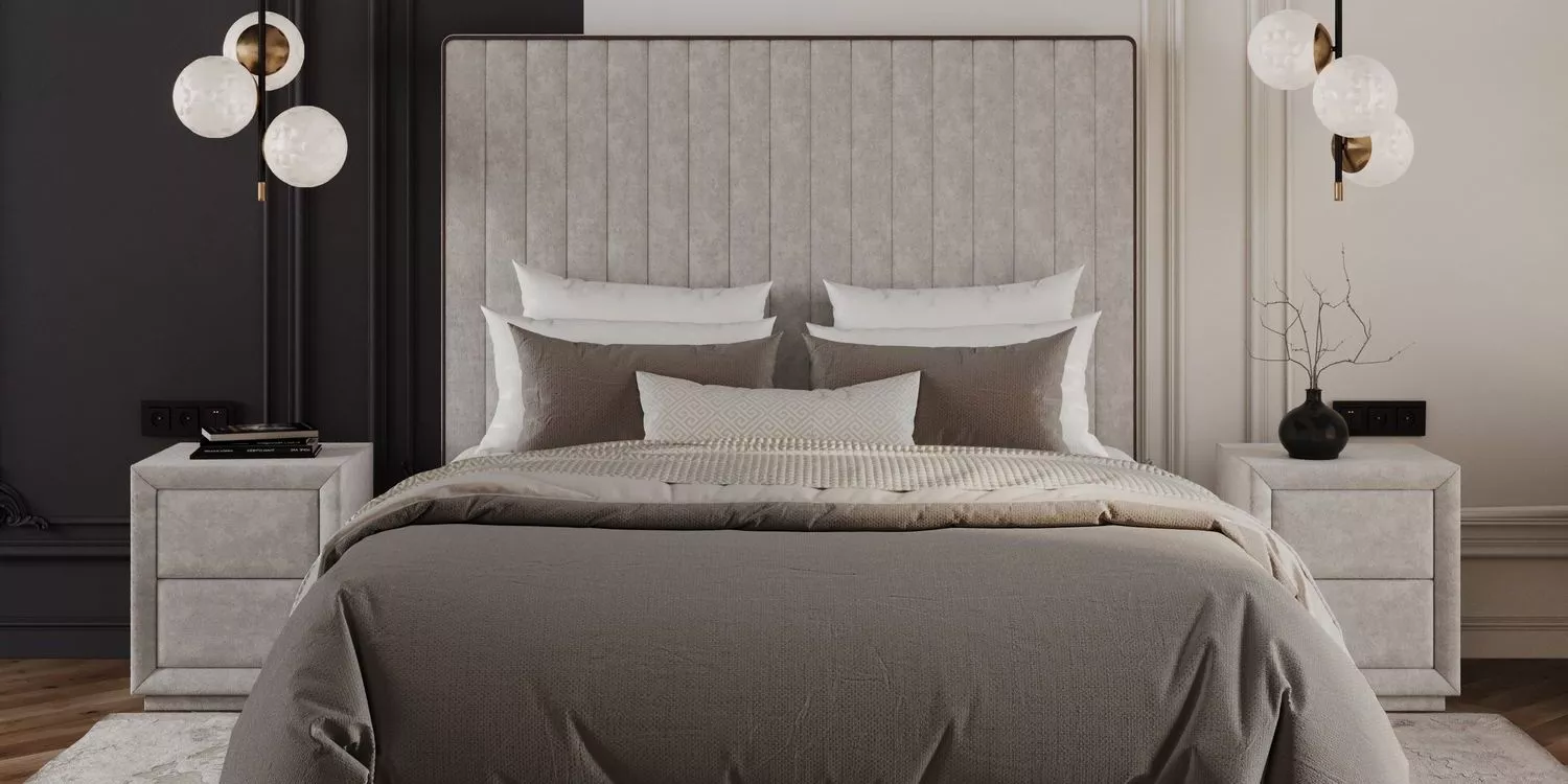 Высокое устойчивое изголовье выполнено из высокопрочных материалов. Вертикальная отстрочка формирует стильный рисунок, а периметр изголовья украшает контрастный кант.
