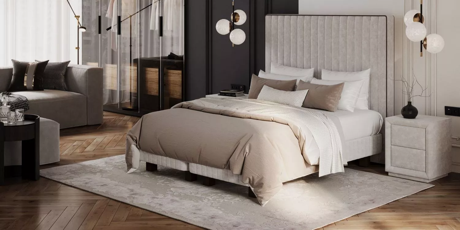 Основание также имеет дизайн вертикальной отстрочки, что идеально формирует комплект с изголовьем. Деревянные ножки из благородной породы массива добавляют премиальности и изящности.