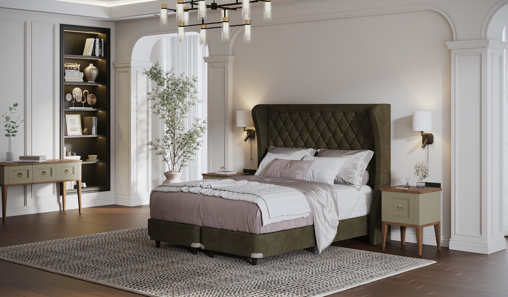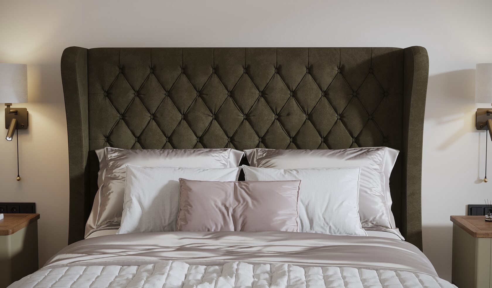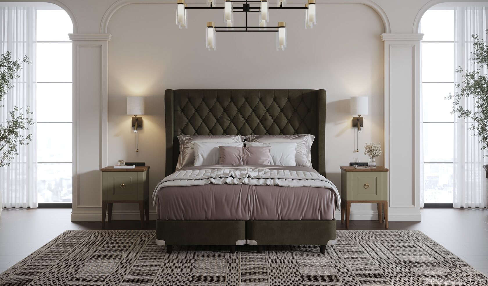 ● Благородное изголовье с классической стяжкой капитоне, создающее атмосферу уюта и роскоши ● Надежные и долговечные опоры из массива дуба ● Брендированные металлические уголки на основании, которые добавляют современный акцент и говорят о продуманности дизайна до мелочей