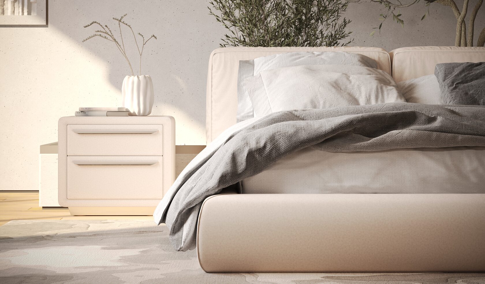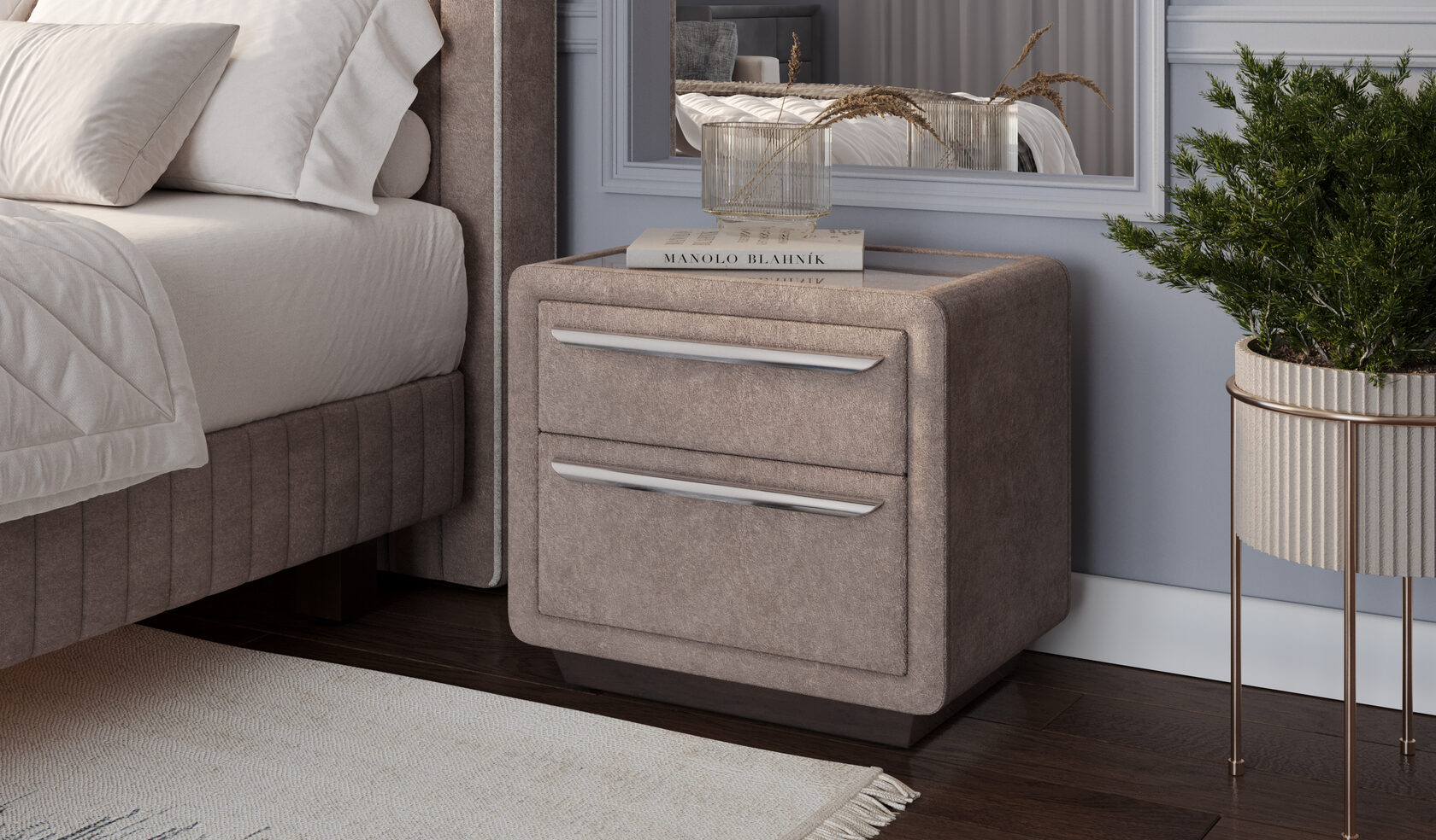 Компактная и вместительная тумба для современной спальни. Беспроводная зарядка в столешнице избавляет от проводов. Дизайн с металлическим цоколем, хромированными ручками и стеклянной столешницей впишется в любой интерьер. Ящики на тихих доводчиках, премиальные материалы отделки.