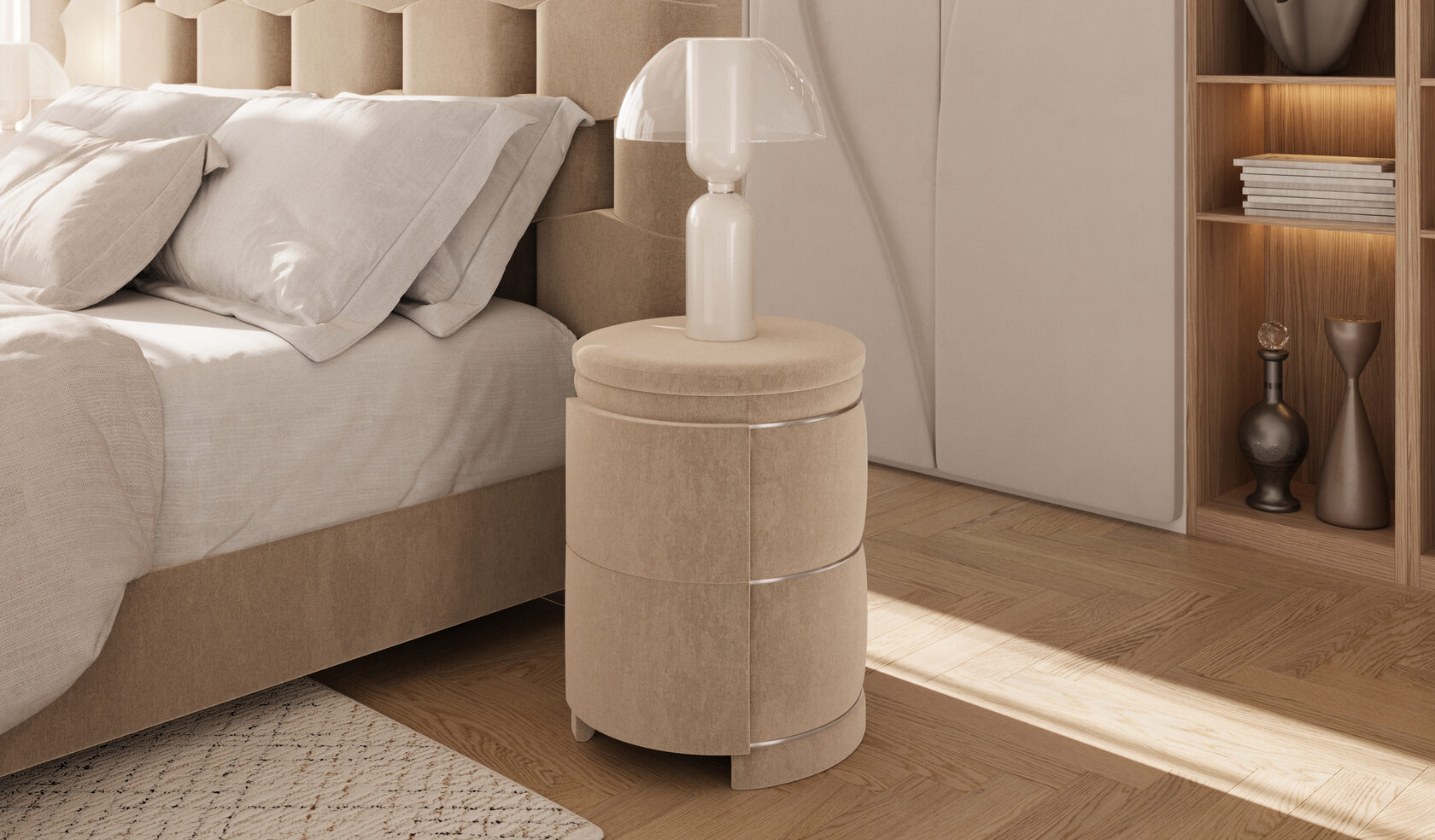 Тумба имеет необычную форму и содержит в себе уникальные технологии: она абсолютно травмобезопасна, имеет плавные и округлые линии. Отсутствие ручек и ножек подчеркивает простоту тумбы, но в тоже время ее изящность и утонченность. Металлическая лента по периметру тумбы дает прямую отсылку к стилю Art Deco. Тумба идеально сочетается и разработана специально для изголовья Verda Art Deco.